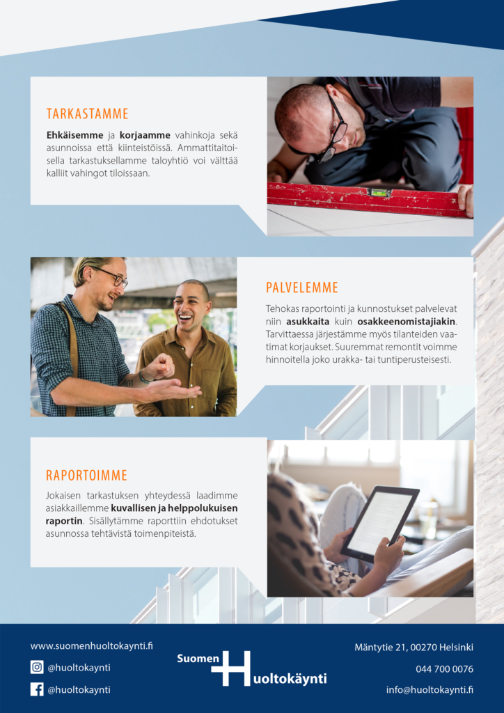 The client wished for flyers, especially the first one, to have as little text as possible. We chose to include only a message that the apartment has been checked. The client didn’t want to include any contact numbers or email addresses to the flyer, so we added only the website address and company’s social media accounts.