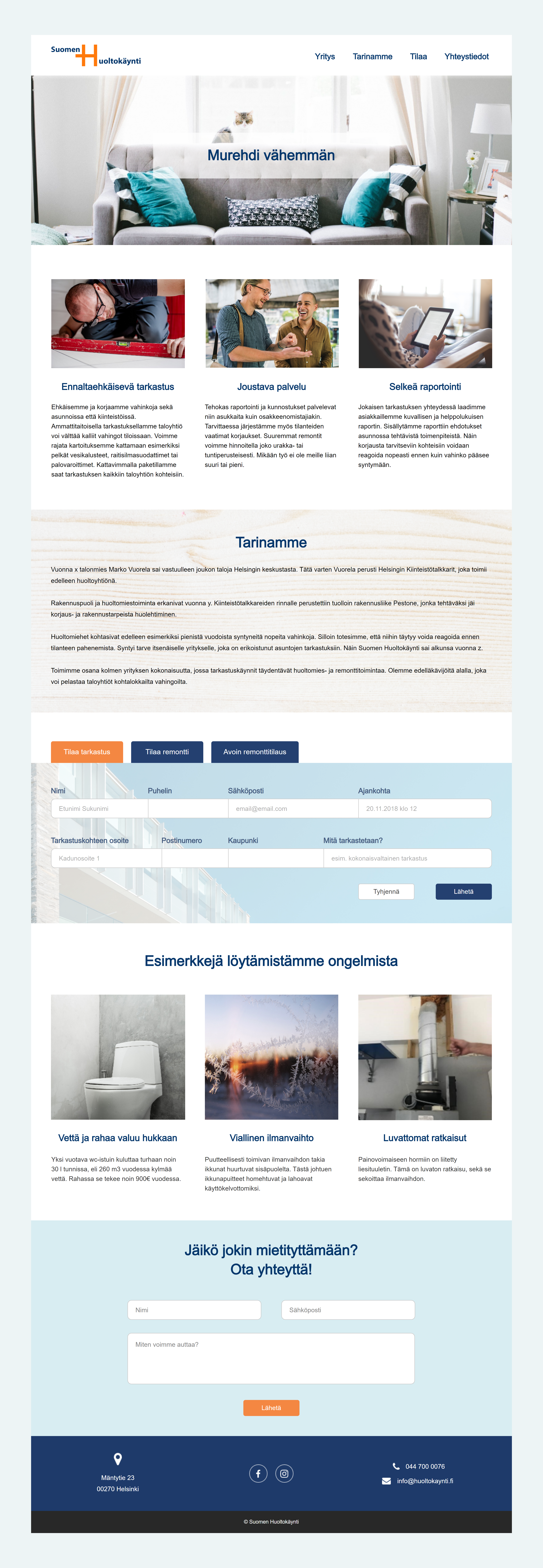 The template is designed to be a one-pager website. The navigation bar is fixed to the top and we placed our group’s planned company’s slogan Murehdi vähemmän (Worry less) in the header section. We also included valuable information about the company and what they do, the company’s backstory and contact forms into the template.
